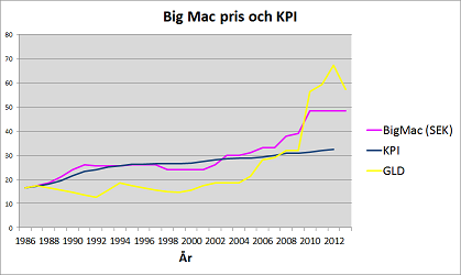 Jag plottade ett diagram med KPI, Guld och Big Mac, för att se hur de står sig över tiden. Vertikal axel visar priset i kronor för en Big Mac eller 194 milligram guld. (194 milligram valdes så att priset matchar en Big Mac 1986).  Priset på en Big Mac sänktes tillfälligt i slutet av 2011 på grund av momssänkningen, men diagrammet bygger på priset i Juli varje år, och priset på en Big Mac var tillbaka på samma nivå igen innan Juli 2012. Därför är diagrammet platt de senaste åren. Om man anser att Big Mac är en bra värdereferens så är guldet faktiskt fortfarande något övervärderat...