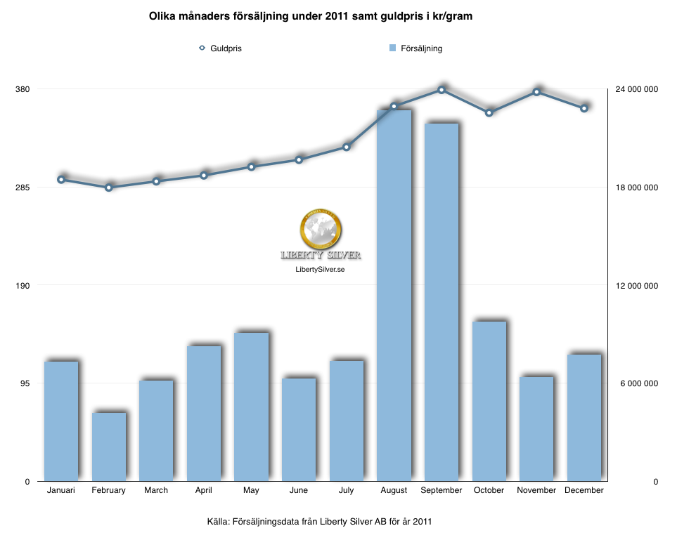 I ovanstående diagram, som visar försäljningen under 2011, kan vi se att priset på guld uppvisade en kraftig ökning under året. Priset steg från 284,25 kr/g i februari till 378,88 kr/g i september. En prisökning på hela 33 procent på bara 7 månader.