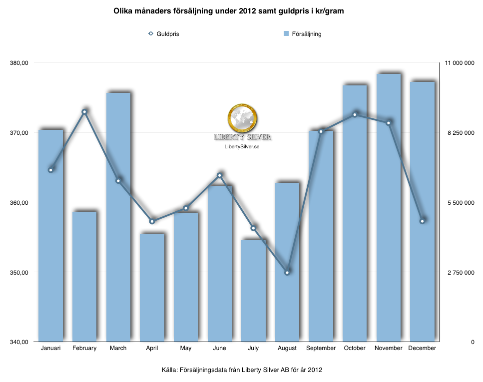 Under 2012 blir förhållandet mellan guldpriset och Liberty Silvers försäljningsiffror mycket tydliga och vi kan se att här är de svenska konsumenterna uppenbarligen väldigt benägna att handla under de månader som världsmarknadspriset på guld ökar.
