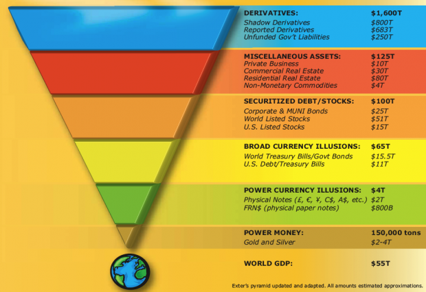 Uppenbarligen har långt i från all rikedom flytt till ädelmetaller ännu. Detta innebär naturligtvis att guld och silver fortfarande är billigt. Även till dagens "höga" priser. En stor möjlighet finns att ta ett "skutt" i pyramiden direkt från tillgångsklasser som aktier och fonder, förbi papperspengar och vidare till de mest värdebevarande tillgångarna - Guld och Silver!