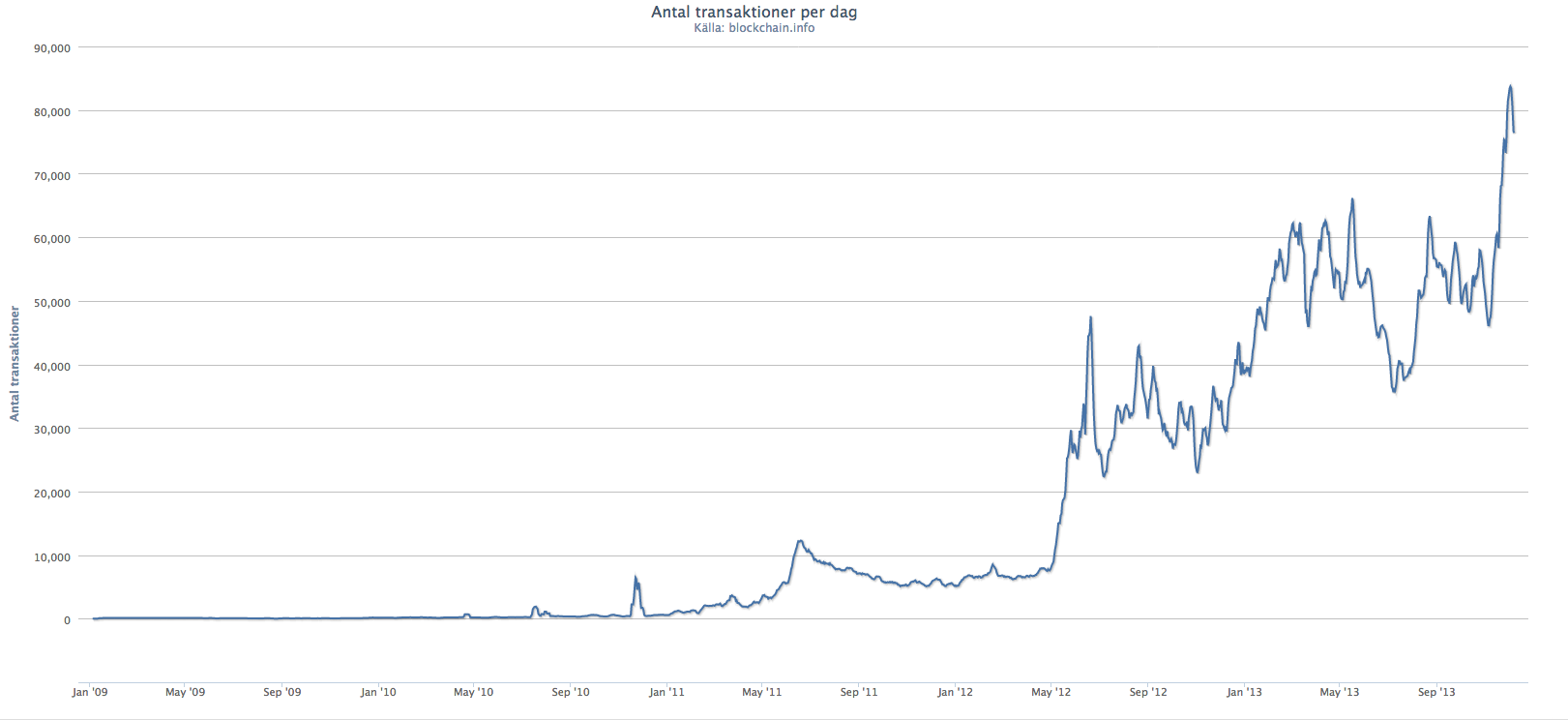 Nedan visas antalet transaktioner per dag från och med jan 2009 fram till december 2013. Samtliga diagram går att förstora upp genom att klicka på dessa.