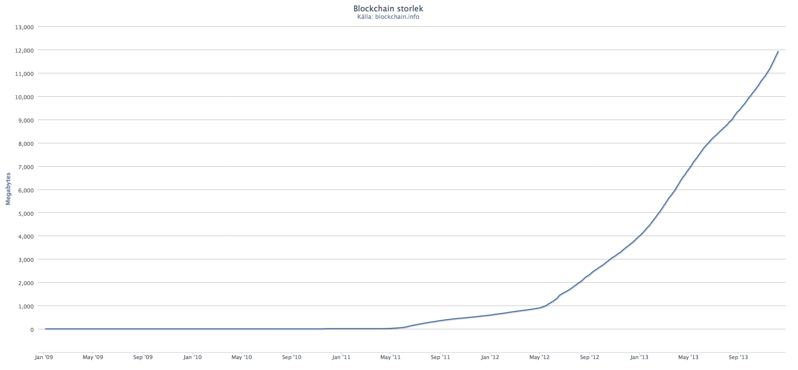 Ju fler transaktioner desto större blir blockchain-filen. Nedan ser vi filens storlek från och med jan 2009 till december 2013.