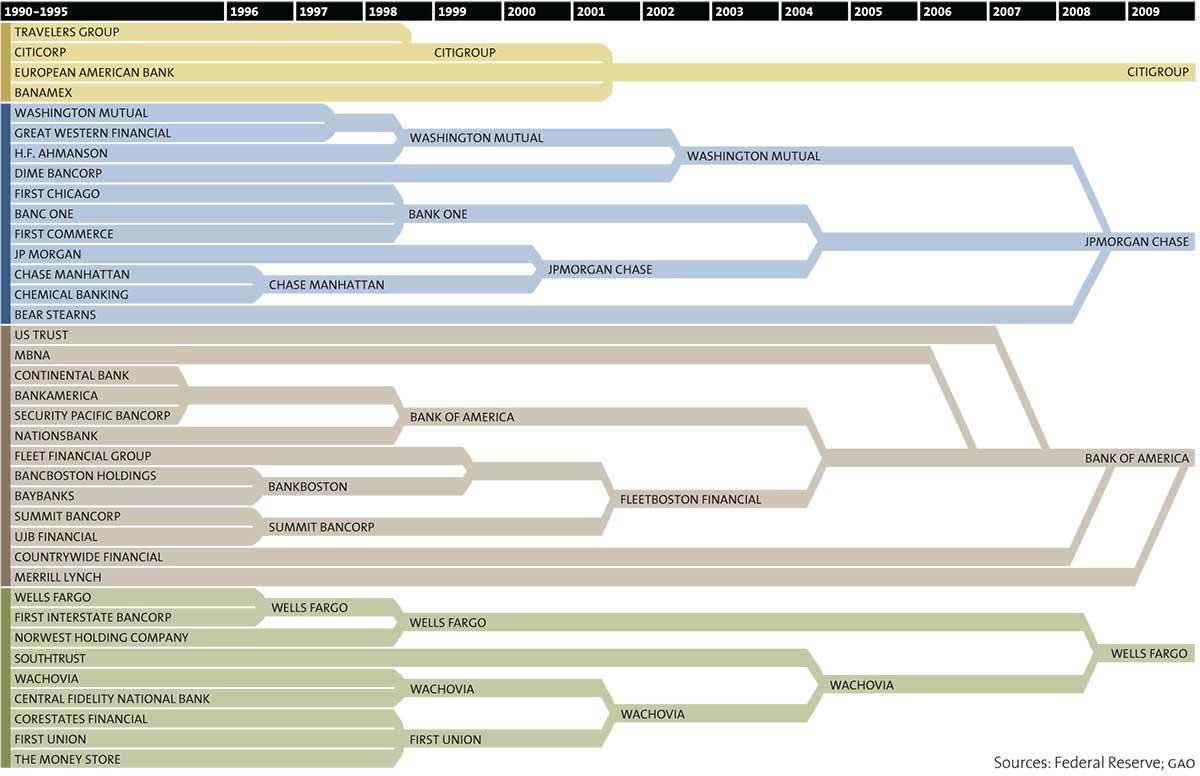 Om du undrar hur en del banker kunde bli ”too big to fail” är det bara att kolla på nedanstående graf som förklarar det mesta. Som man kan se började 90-talet med 37 banker i USA. Under de kommande 10-15 åren blev dessa, genom en rad sammanslagningar, i praktiken till endast 4 storbanker.