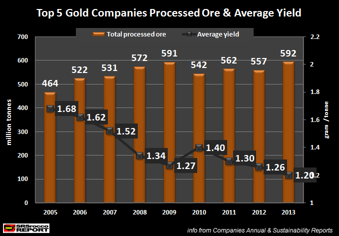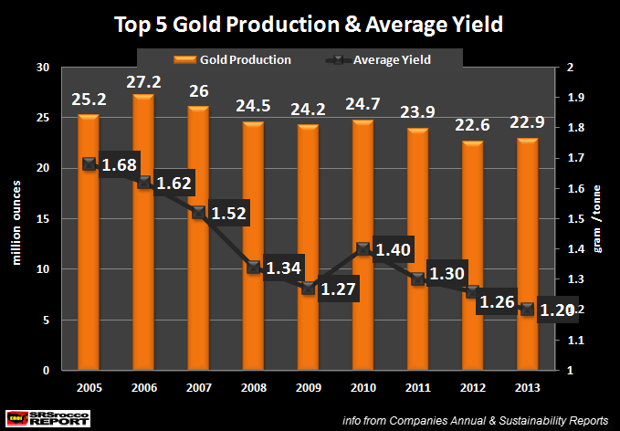 Siffror för 2013 har nu kommit in och avkastningen hos de 5 största guldproducenterna (Barrick, Newmont, AngloGold, Goldfields & Goldcorp) föll under föregående år till de lägsta nivåerna någonsin. Som vi ser på grafen nedan (från srsroccoreport.com) var avkastningen år 2005 1,68 gram guld per ton utvunnen gravmalm. Detta förhållande är nu nere på 1.20 gram/ton - en 29 procentig nedgång på 8 år!