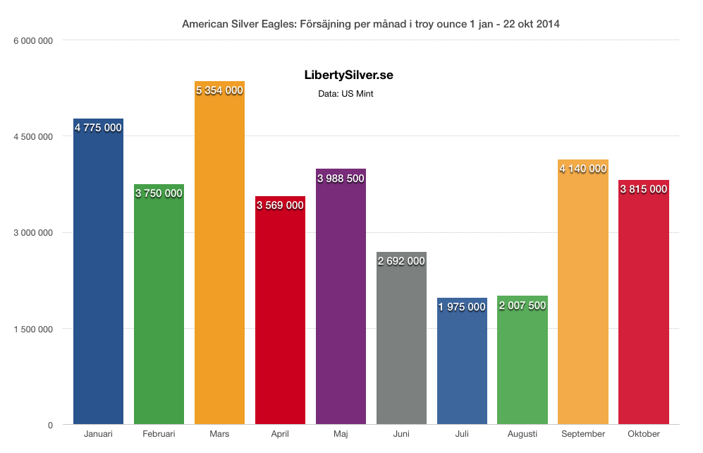 Totalt har US Mint hittills sålt 36 miljoner American Silver Eagles under 2014. Med mer än 2 månader kvar av året har man alltså goda chanser att klå försäljningen för rekordåret 2013 där slutsiffran hamnade på 42 675 000 sålda Silver Eagles.